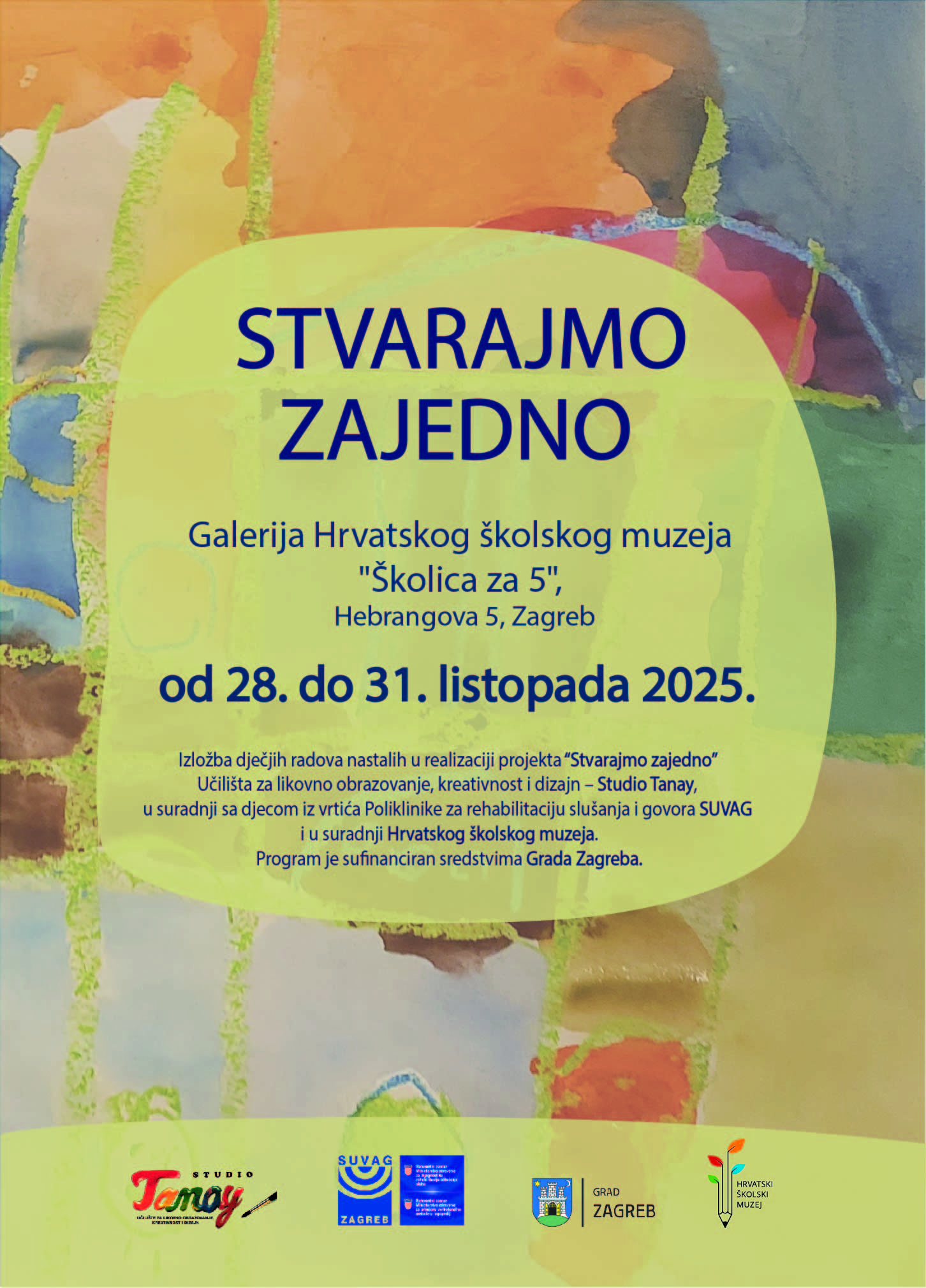 Izložba dječjih radova nastalih u realizaciji projekta “Stvarajmo zajedno” Učilišta za likovno obrazovanje, kreativnost i dizajn – Studio Tanay, u suradnji sa djecom iz vrtića Poliklonike za rehabilitaciju slušanja i govora SUVAG i u suradnji Hrvatskog školskog muzeja. Program je sufinanciran sredstvima Grada Zagreba. Izložba je otvorena od 28. do 31. listopada 2025.